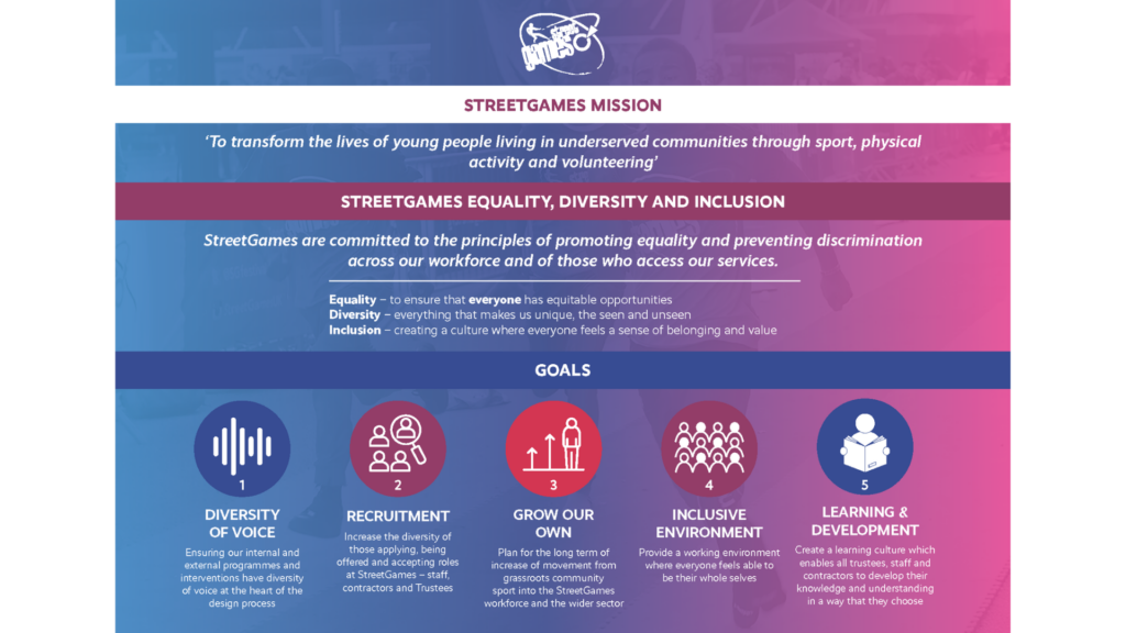This overarching Equality & Diversity & Inclusion Policy is intended to communicate the importance of addressing equality, and diversity and inclusion issues in the work of StreetGames UK Ltd. It also highlights our responsibilities as an employer and standard bearer in sport.